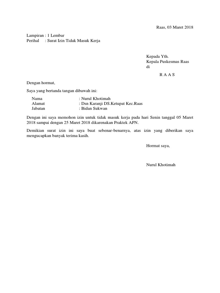 Contoh surat izin sakit tidak masuk kerja. Waktu izin tidak masuk kerja. Dengan adanya surat ini, saya bermaksud memohon izin tidak masuk kerja pada tanggal 21 maret 2018 dikarenakan pada tanggal tersebut saya diharuskan pergi ke sumatra untuk menghadiri acara pernikahan saudara kandung saya selama 1. Surat izin kerja dibuat oleh pegawai untuk diberikan pada atasan atau hrd dengan tujuan meminta izin karena berhalangan masuk kerja. Disebut surat pribadi karena ditulis perseorangan dan dinas karena ditujukan untuk instansi tertentu.